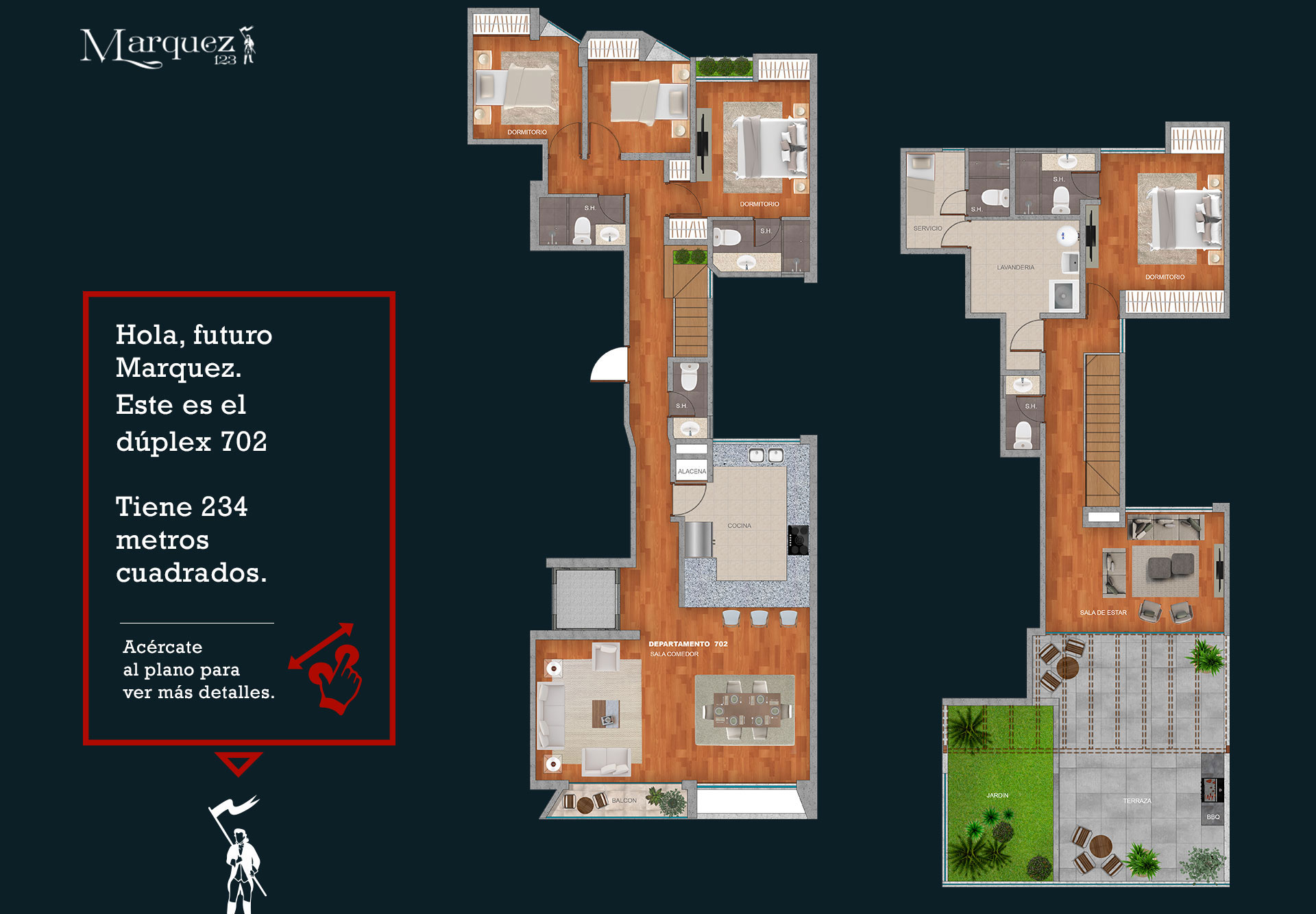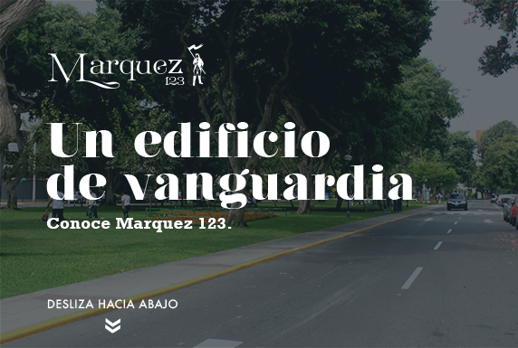 Destácate viviendo en un edificio de vanguardia superando los más altos niveles de comfort, elegancia y tendencias. Desarrollado en una zona estratégica libre de tránsito y del bullicio dentro del distrito de Miraflores; “Marquez 123” se encuentra a un paso de todo lo que necesitas: Supermercados, Gimnasios, Parque Melitón – Porras, Larcomar y finos restaurantes. Situado a una cuadra del malecón para que puedas salir a pasear o ejercitarte.